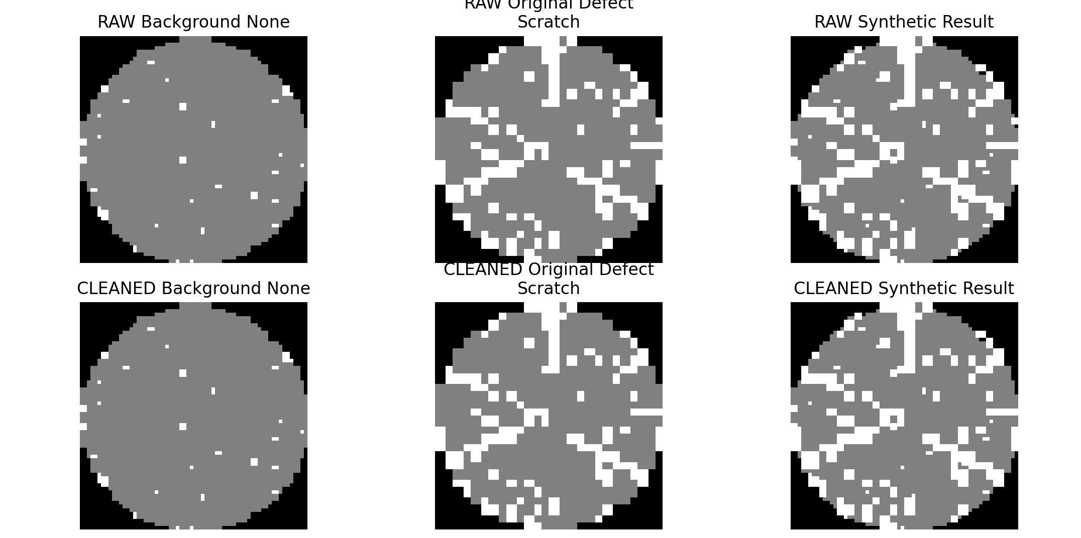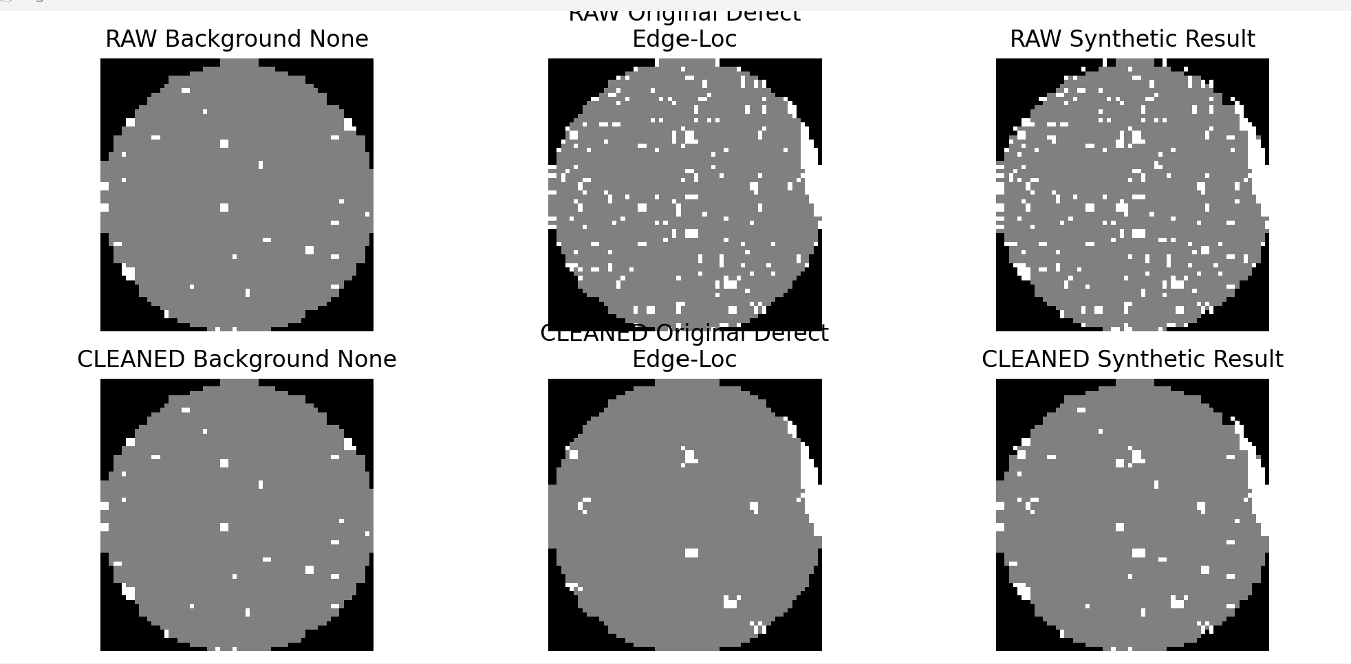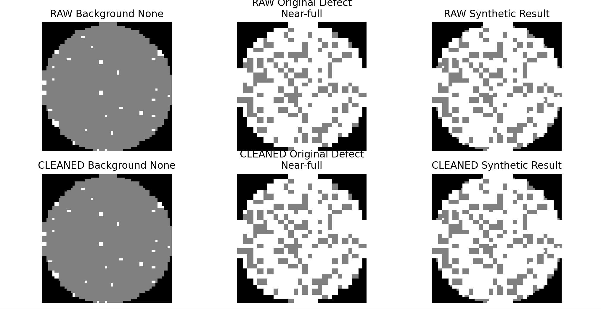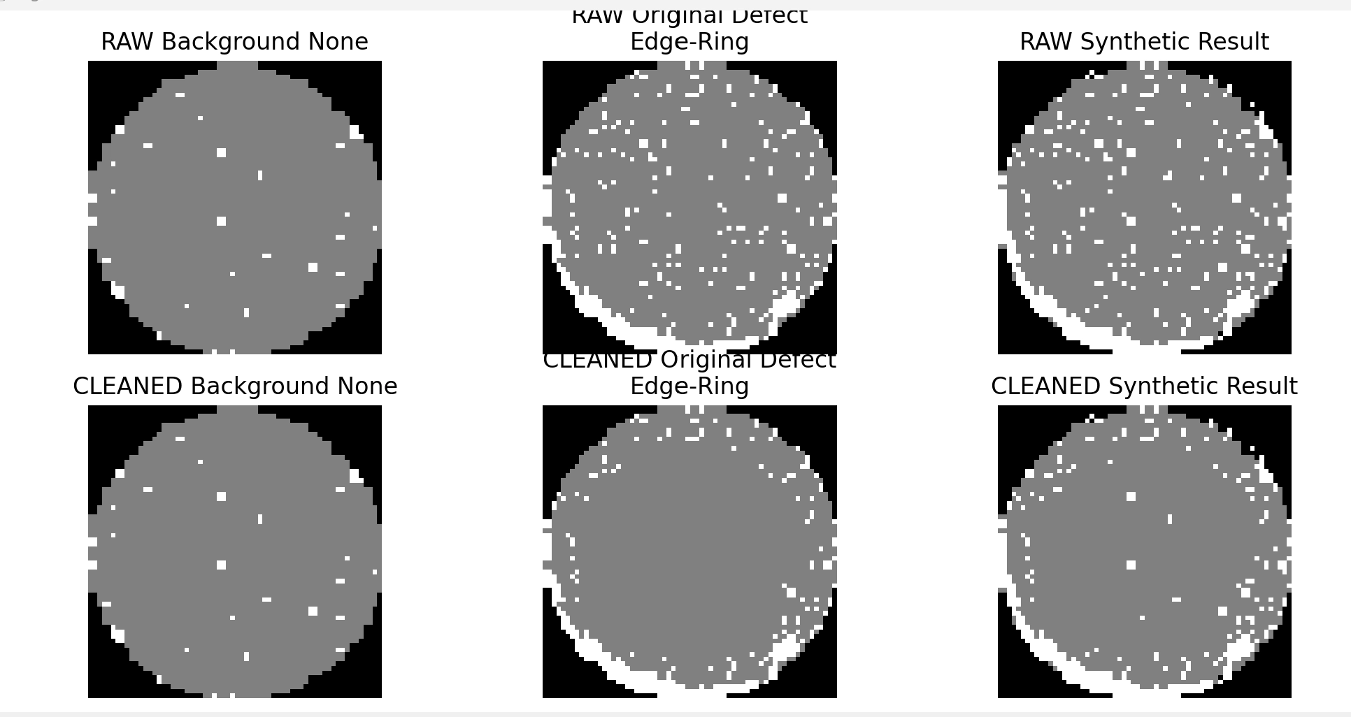 전처리 코드도 다시 검토했다. 현재 cleaned 데이터셋은 모든 클래스를 일괄적으로 정제한 버전이 아니라, 클래스 특성에 따라 선택적으로 노이즈 제거를 적용하는 구조로 되어 있다. none, Random, Near-full은 원형을 유지하고, Edge-Ring과 Scratch는 전용 필터를 적용하며, 나머지 덩어리형 결함 클래스는 면적 기반 필터를 적용하는 방식이다. 이를 바탕으로 이번 합성 실험은 공통 none 배경 위에 raw 결함 패턴과 cleaned 결함 패턴을 각각 삽입해, 결함 패턴 정제 여부가 분류 성능에 미치는 영향을 비교하기 위한 단계로 정리했다.